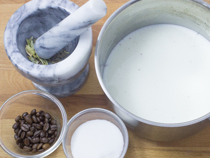 In a medium pot, place the milk and ¼ cup (50 g) of the Redpath® Granulated Sugar, coffee beans, crushed cardamom pods and the vanilla bean. Stir to combine. Place on medium heat until it just begins boil. Remove from heat.