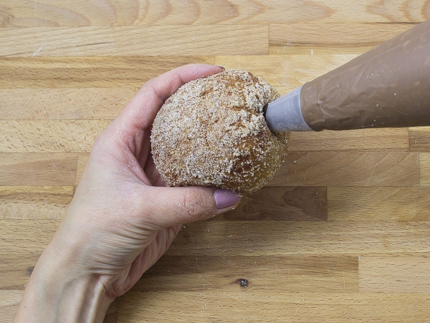 Fill a piping bag, fitted with a small plain piping tip, with the Chocolate Cardamon Cream. Insert tip into each beignet and fill.